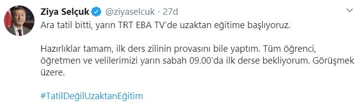 "Ara tatil bitti, yarın TRT EBA TV'de uzaktan eğitime başlıyoruz. Hazırlıklar tamam, ilk ders zilinin provasını bile yaptım. Tüm öğrenci, öğretmen ve velilerimizi yarın sabah 09.00'da ilk derse bekliyorum. Görüşmek üzere." şeklinde paylaşımda bulundu.
