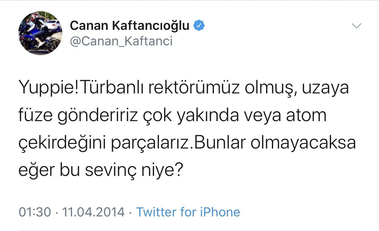 Aynı Canan Kaftancıoğlu, 2014 senesinde başörtülü bir rektör atanmasına tepki göstermişti. Kaftancıoğlu, “Yuppie! Türbanlı rektörümüz olmuş, uzaya füze göndeririz çok yakında veya atom çekirdeğini parçalarız. Bunlar olmayacaksa eğer bu sevinç niye?” ifadelerini kullanmıştı.