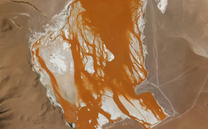 7 Eylül’de çekilen ilk görüntü, Bolivya And Dağları’ndaki Laguna Colorada’nın Güney Amerika kıyısına doğru ilerlediğini gösteriyor. Buradaki paslı kırmızı renk, özellikle aşırı tuzlu sığ sularda olmak üzere optimum çevre koşullarının ardından kırmızı alglerin çoğalmasının bir sonucu.