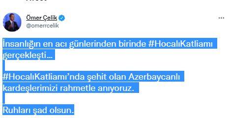 Resmi sosyal medya hesabından paylaşımda bulunan AK Parti Genel Başkan Yardımcısı ve Parti Sözcüsü Ömer Çelik, “İnsanlığın en acı günlerinden birinde #HocalıKatliamı gerçekleşti… #HocalıKatliamı’nda şehit olan Azerbaycanlı kardeşlerimizi rahmetle anıyoruz. Ruhları şad olsun” dedi.