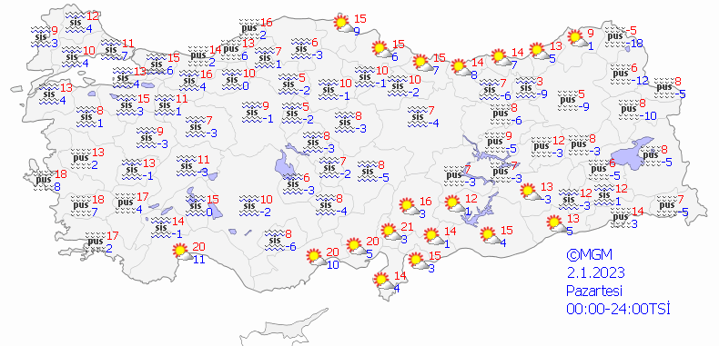 Meteoroloji Genel Müdürlüğü tarafından yapılan son değerlendirmelere göre: Ülkemiz genelinde yağış beklenmiyor. Az bulutlu ve açık geçeceği tahmin ediliyor. Marmara Bölgesi ile iç ve doğu kesimlerde yer yer sis ve pus bekleniyor.