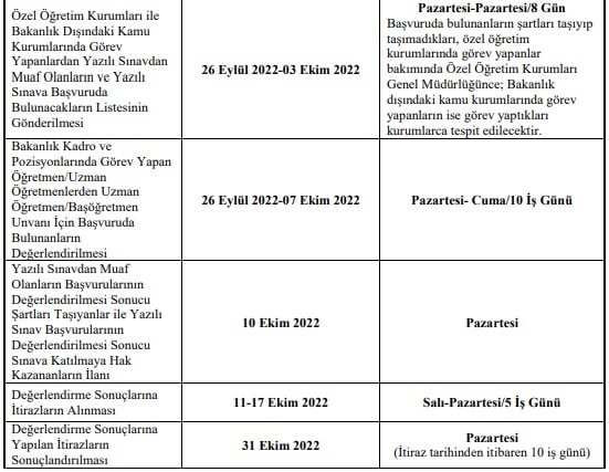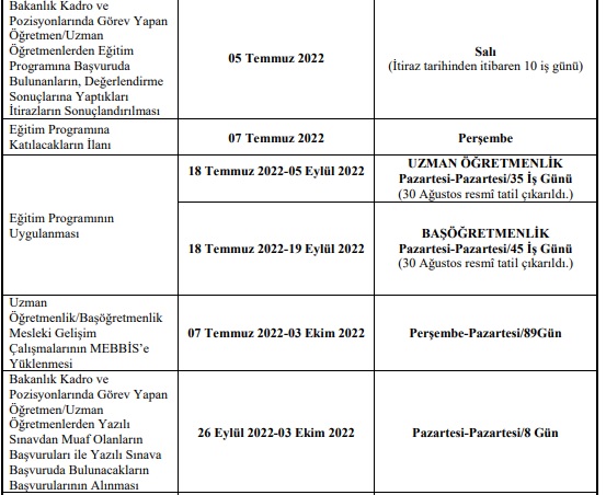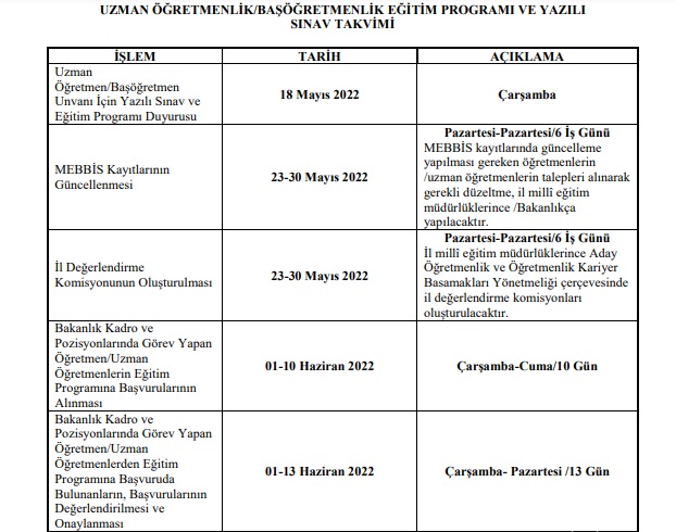 Eğitim programının başvuruları 01-10 Haziran 2022 tarihleri arasında alınacak olup uzman öğretmenlik eğitimleri 18 Temmuz-05 Eylül 2022, başöğretmenlik eğitimleri ise 18 Temmuz-19 Eylül 2022 tarihleri arasında gerçekleştirilecek.