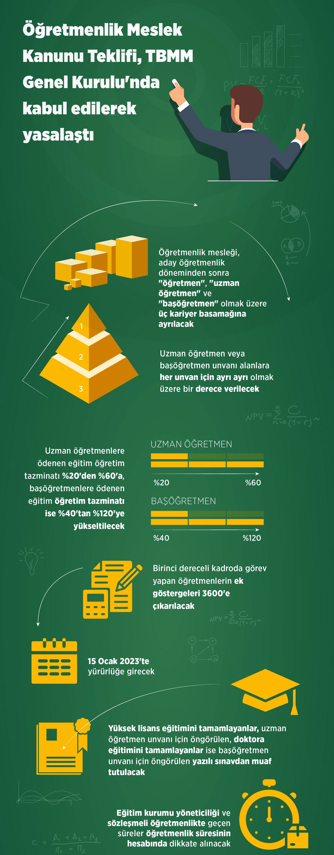 Öğretmenlik mesleği, aday öğretmenlik döneminden sonra "öğretmen", "uzman öğretmen" ve "başöğretmen" olmak üzere üç kariyer basamağına ayrılacak. Uzman öğretmen unvanı için yapılan yazılı sınavda, 70 ve üzeri puan alanlar başarılı sayılacak. Yazılı sınavda başarılı olanlara uzman öğretmen sertifikası verilecek. Başöğretmenlik için öngörülen çalışmaları tamamlayanlar başöğretmen unvanı için yapılan yazılı sınava başvuruda bulunabilecek. Yazılı sınavda 70 ve üzeri puan alanlar başarılı sayılacak. Yazılı sınavda başarılı olanlara başöğretmen sertifikası verilecek.