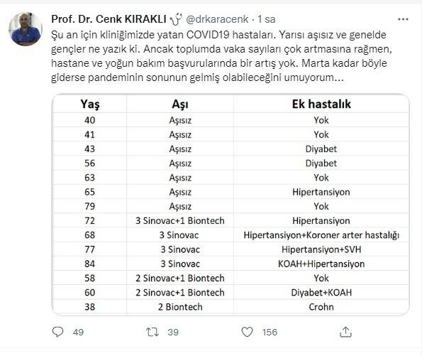 Göğüs Hastalıkları ve Yoğun Bakım Uzmanı Prof. Dr. Cenk Kıraklı sosyal medya hesabından yaptığı paylaşımla özellikle gençleri uyarırken, “Şu an için kliniğimizde yatan COVID19 hastaları. Yarısı aşısız ve genelde gençler ne yazık ki. Ancak toplumda vaka sayıları çok artmasına rağmen, hastane ve yoğun bakım başvurularında bir artış yok. Marta kadar böyle giderse pandeminin sonunun gelmiş olabileceğini umuyorum... Bu arada tam koruma kabul edilen 2 Sino+2 Biontech hala yok. 2 Biontechli ilk hastamız da ne yazık ki bağışıklık baskılayıcı ilaç kullanıyordu.” ifadelerini kullandı.