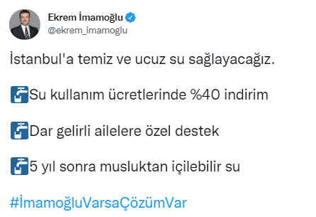 CHP'li İstanbul Büyükşehir Belediye Başkanı Ekrem İmamoğlu'nun, 31 Mart 2019 yerel seçimi öncesinde, "İmamoğlu varsa çözüm var." diyerek, "Su kullanım ücretlerinde %40 indirim." yapacağım vaadi de balon oldu.