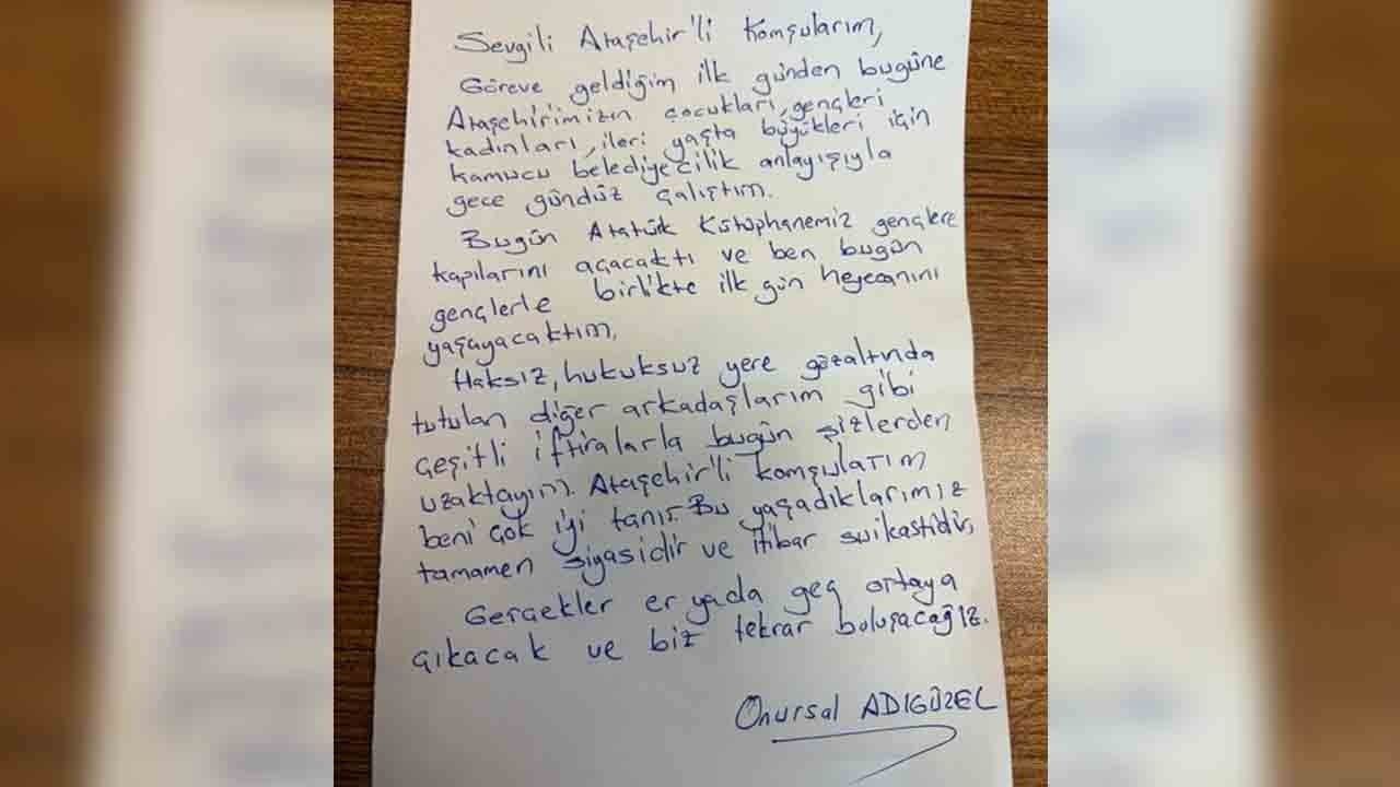 Onursal Adıgüzel, sosyal medya hesabından paylaştığı mektubunda şunları yazdı: “Sevgili Ataşehirli komşularım; Göreve geldiğim ilk günden bugüne Ataşehirimizin çocukları, gençleri, kadınları, ileri yaşta büyükleri için kamucu belediyecilik anlayışıyla gece gündüz çalıştım. Bugün Atatürk Kütüphanemiz gençlere kapılarını açacaktı ve ben bugün gençlerle birlikte ilk gün heyecanını yaşayacaktım. Haksız, hukuksuz yere gözaltında tutulan diğer arkadaşlarım gibi çeşitli iftiralarla bugün sizlerden uzaktayım. Ataşehirli komşularım beni çok iyi tanır. Bu yaşadıklarımız tamamen siyasidir ve itibar suikastidir. Gerçekler er yada geç ortaya çıkacak ve bizler tekrar buluşacağız”