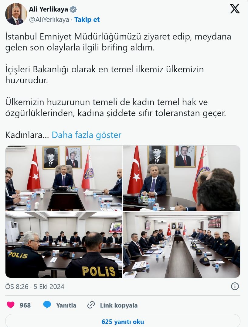 Bakan Yerlikaya, sosyal medya hesabından "Türkiye'nin huzuru" etiketiyle yaptığı paylaşımda, İstanbul Emniyet Müdürlüğünü ziyaret edip, meydana gelen son olaylarla ilgili brifing aldığını belirtti.