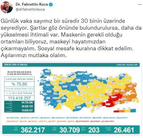 Sağlık Bakanlığı'nın yayınladığı 14 Ekim koronavirüs tablosuna göre; Türkiye'de son 24 saatte 362 bin 217 Kovid-19 testi yapıldı, 30 bin 709 kişinin testi pozitif çıktı, 203 kişi yaşamını yitirdi. Bakan Koca "Şartlar göz önünde bulundurulursa, daha da yükselmesi ihtimali var." ifadelerini kullanarak uyardı.