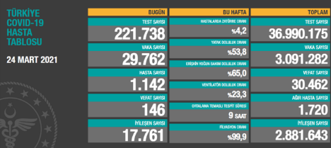 Türkiye genelinde corona virüs salgınında vaka, can kaybı ve ağır hasta sayısı artıyor. Vaka sayısı son ayların en yüksek seviyesinde. Türkiye'de son 24 saatte 221 bin 738 Covid-19 testi yapıldı, 29 bin 762 kişinin testi pozitif çıktı, 146 kişi hayatını kaybetti. Ağır hasta sayısı 1720 oldu, 17 bin 761 kişinin Covid-19 tedavisinin/karantinasının sona ermesiyle iyileşen sayısı 2 milyon 881 bin 643'e yükseldi. Dün açıklanan verilere göre de 211 bin kişiye yapılan testlerden 26 bin 182'si pozitif çıkmış, 138 kişi hayatını kaybetmişti.