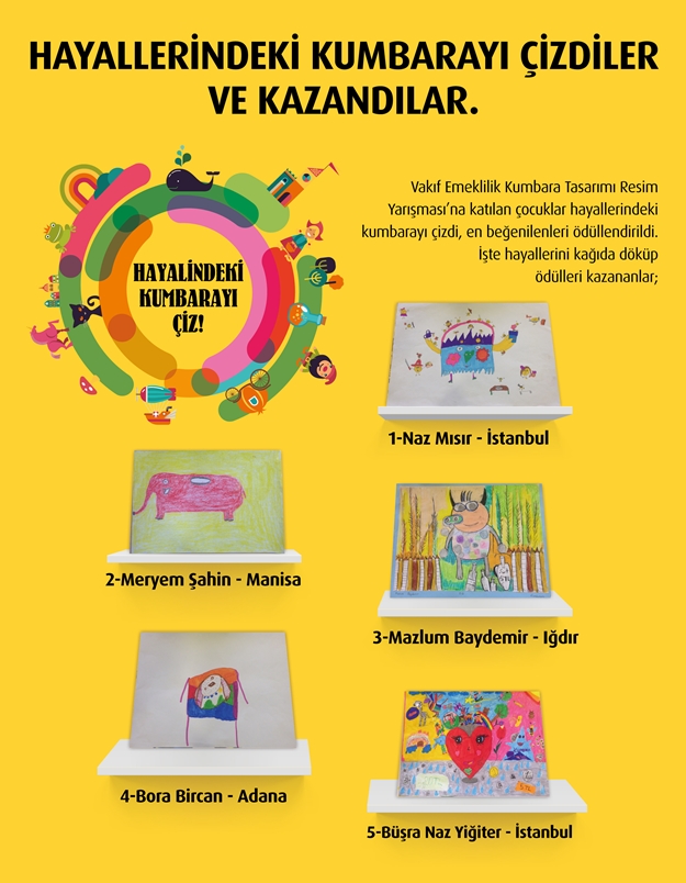 Bireysel Emeklilik sektörünün öncü şirketi Vakıf Emeklilik de Türkiye’de finansal okuryazarlığı artıracak toplumsal sosyal sorumluluk projelerine imza atıyor. Vakıf Emeklilik, çocuklara küçük yaşlardan itibaren tasarruf bilincini kazandırmak amacıyla ilkokullara yönelik olarak Kumbara Tasarımı Resim Yarışması düzenliyor. 7-10 yaş arası ilköğretim öğrencilerinin hayallerindeki kumbarayı resme döktükleri bu yarışma ile geleceğin bireylerine tasarrufun önemi aşılanıyor. Türkiye genelinde düzenlenen yarışmanın üçüncüsü bu yıl Eylül ayında gerçekleştirilecek.