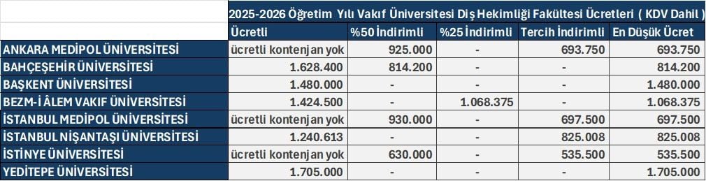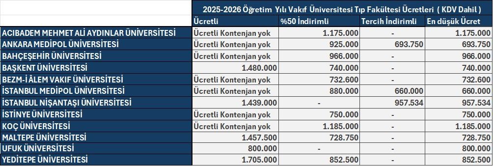 Üniversite tercih dönemi yaklaşırken, öğrenciler ve aileler yalnızca başarı sıralamasını değil, eğitim maliyetlerini de dikkate alarak kararlarını şekillendiriyor. Ekonomik dalgalanmalar ve artan yaşam maliyetleri, üniversite ücretlerinin önceki yıllara göre daha belirleyici hale gelmesine yol açtı. Vakıf üniversitelerinde öğrenim ücretleri programlara göre farklılık gösterse de, tıp, diş, işletme ve hukuk gibi prestijli bölümler başta olmak üzere birçok program, ‘burslu’ ve ‘indirimli’ kontenjanlar sayesinde öğrenciler için daha ulaşılabilir hale geliyor.