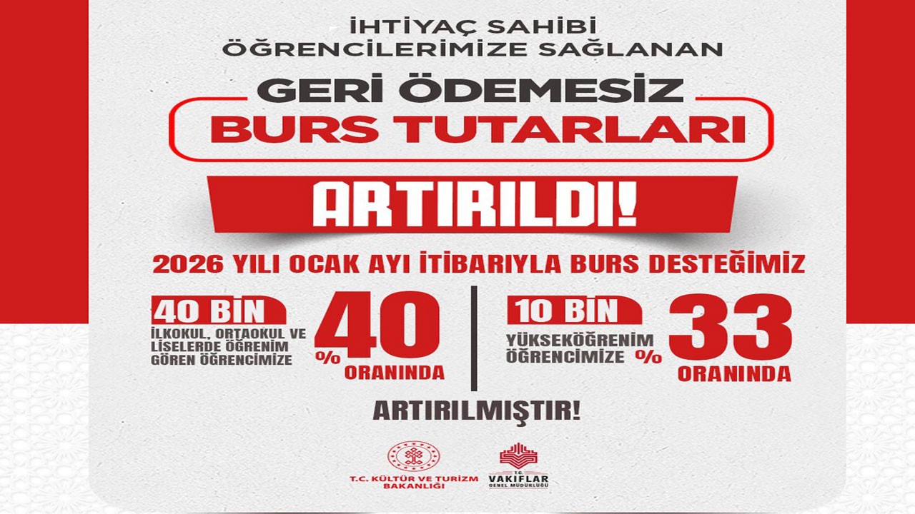 Vakıflar Genel Müdürlüğü’nün sanal medya hesabından yapılan açıklamada, şu bilgiler verildi: "İhtiyaç sahibi öğrencilerimize sağlanan geri ödemesiz burs tutarları artırıldı. Bu kapsamda, 2026 yılı ocak ayı itibarıyla; ilkokul, ortaokul ve liselerde öğrenim gören 40 bin öğrencimize verilen burs desteğimiz 1250 TL’den 1750 TL’ye yükseltildi."