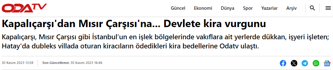 Oda TV haberinde, "Kapalıçarşı'dan Mısır Çarşısı'na... Devlete kira vurgunu" başlığını kullandı.