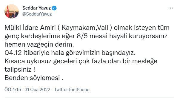 Ülkemizi etkisi altına alan soğuk ve karlı hava koşullarında gece gündüz demeden çalışan Kocaeli Valisi Seddar Yavuz gençlerin meslek seçimlerinde dikkat etmesi konulardan birinin de mesai olduğunu belirterek, mülki idare amiri (Kaymakam, Vali) gibi meslekleri seçmeleri durumunda, “Uykusuz geceleri çok fazla olan bir mesleğe talipsiniz” diyerek uyarda bulundu. Sabaha karşı 04:12’de sosyal medya hesabından paylaşım yapan Vali Yavuz, “Mülki İdare Amiri ( Kaymakam,Vali ) olmak isteyen tüm genç kardeşlerime eğer 8/5 mesai hayali kuruyorsanız hemen vazgeçin derim. 04.12 itibariyle hala görevimizin başındayız. Kısaca uykusuz geceleri çok fazla olan bir mesleğe talipsiniz ! Benden söylemesi.” sözleriyle gençlere, halka hizmet etmek için gece gündüz demeden çalışılması gereken bir meslek olduğunu anlatmaya çalıştı.