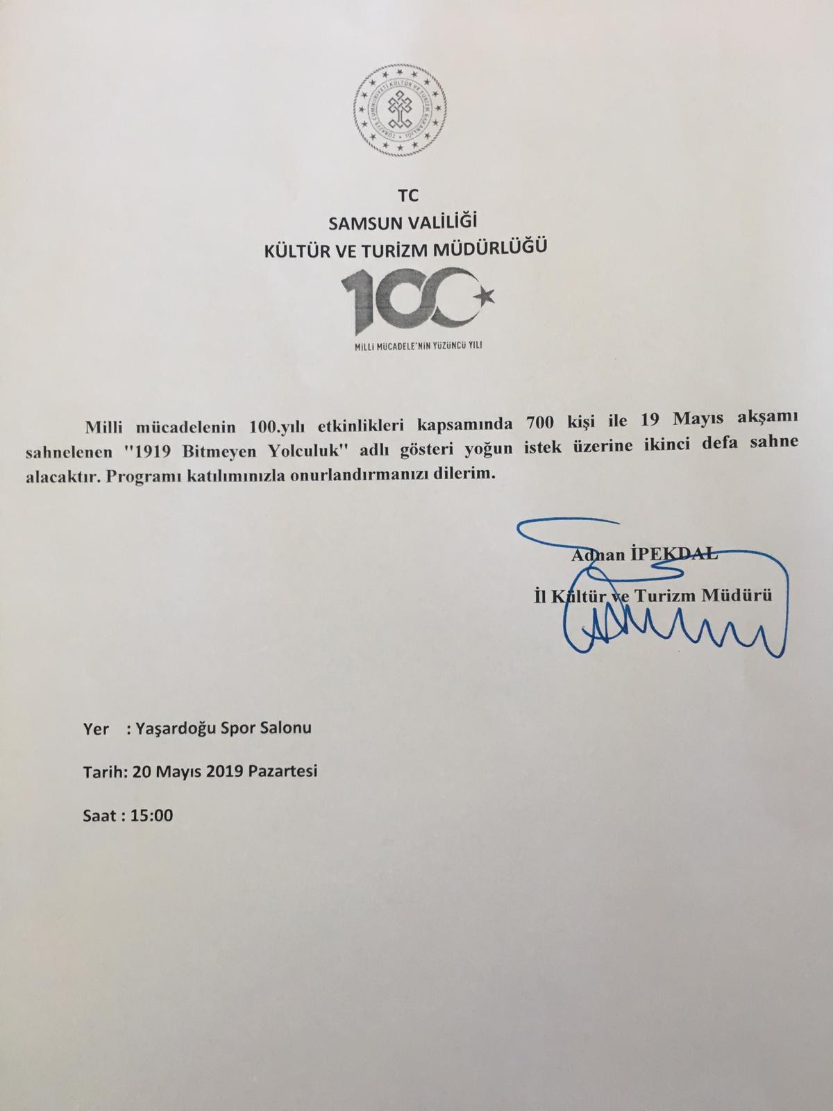 Samsun Valiliği Kültür ve Turizm Müdürlüğünden gelen açıklamada, “Milli mücadelenin 100.yılı etkinlikleri kapsamında 700 kişi ile 19 Mayıs akşamı sergilenen "1919 Bitmeyen Yolculuk" adlı gösteri yoğun istek üzerine ikinci defa sahne alacaktır” ifadelerine yer verildi.