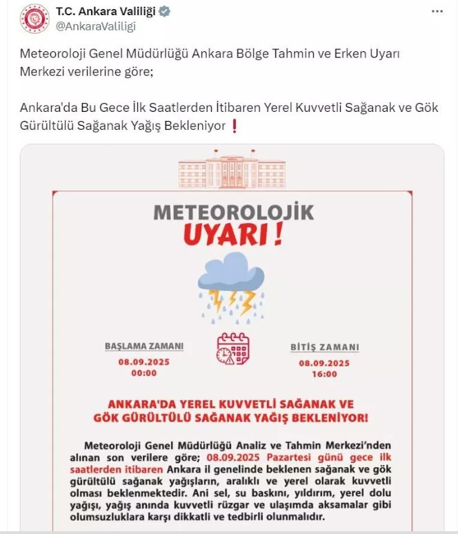 Valiliğin sosyal medya hesabından yapılan açıklamada, "Meteoroloji Genel Müdürlüğü Analiz ve Tahmin Merkezi'nden alınan son verilere göre; 8 Eylül 2025 Pazartesi günü gece ilk saatlerden itibaren Ankara il genelinde beklenen sağanak ve gök gürültülü sağanak yağışların, aralıklı ve yerel olarak kuvvetli olması beklenmektedir. Ani sel, su baskını, yıldırım, yerel dolu yağışı, yağış anında kuvvetli rüzgar ve ulaşımda aksamalar gibi olumsuzluklara karşı dikkatli ve tedbirli olunmalıdır" denildi.