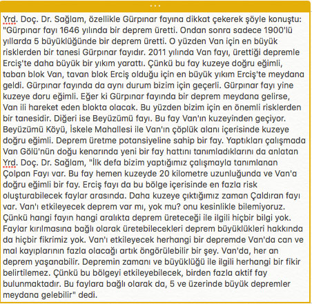 Bu fayların yıkıcı özelliklerine de dikkat çeken Yrd.Doç.Dr. Sağlam, bunun Van için risk oluşturduğunu söyledi. Yrd.Doç.Dr. Sağlam, "Biz yaptığımız proje sonunda şunu gördük. Özellikle Van bölgesi içinde en fazla risk oluşturabilecek faylar Gürpınar, Beyüzümü, Van fay zonu ve Yeni Köşk fayı. 23 Ekim 2011 yılında meydana gelen deprem de bindirme fayına bağlı olarak meydana geldi. 9 Kasım da meydana gelen deprem de doğrultu atılımlı bir fayda meydana geldi. Biz bu nedenle diyoruz ki yaklaşık olarak 50 kilometre uzunluğundaki Gürpınar fayında veya Beyüzümü fayına bağlı olarak bir deprem meydana gelirse, Van için büyük risk oluşturacaktır. Hem can hem de mal kaybı olacak" diye konuştu.