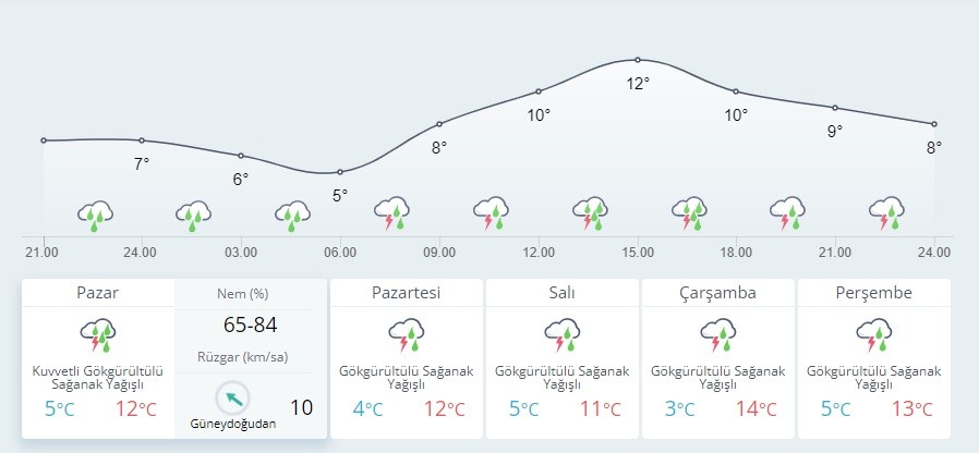 Bölge genelinde havanın çok bulutlu, aralıklı sağanak ve gök gürültülü sağanak yağışlı, 8 Mayıs Pazar öğle saatlerinde Van, Muş ve Bitlis çevrelerinde yer yer kuvvetli sağanak yağışlı olması beklenmektedir. Yağışların bölgenin yüksek kesimlerinde kar ve karla karışık yağmur şeklinde olması tahmin edilmektedir.