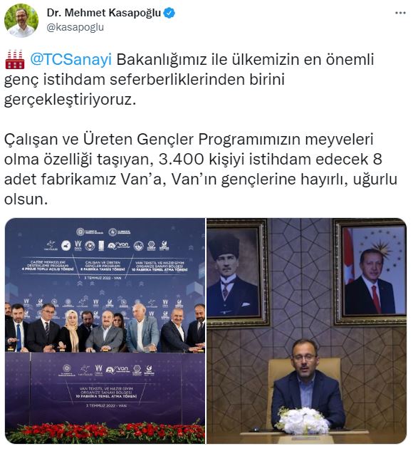 Gençlik ve Spor Bakanı Dr. Mehmet Kasapoğlu, sosyal medya hesabı üzerinden yaptığı paylaşım ile Van’lı gençleri sevindirdi. Kasapoğlu paylaşımında, “@TCSanayi Bakanlığımız ile ülkemizin en önemli genç istihdam seferberliklerinden birini gerçekleştiriyoruz. Çalışan ve Üreten Gençler Programımızın meyveleri olma özelliği taşıyan, 3.400 kişiyi istihdam edecek 8 adet fabrikamız Van’a, Van’ın gençlerine hayırlı, uğurlu olsun” ifadelerini kullandı.