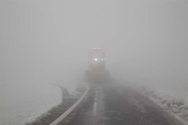Ekipler, yoğun sis ve yağışa rağmen iş makineleriyle yolda biriken karları temizleme çalışmalarını sürdürüyor.