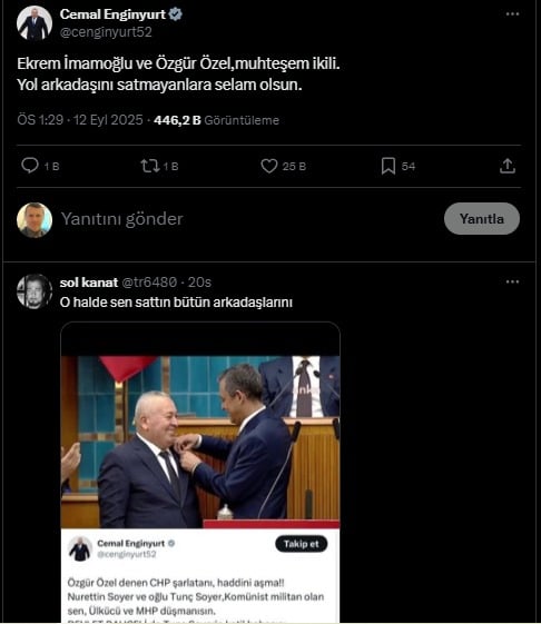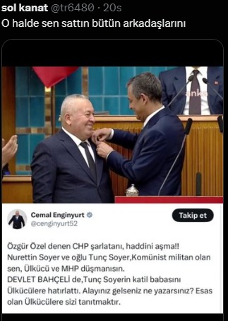 Enginyurt’un paylaşımının hemen altına MHP’deyken CHP aleyhinde yaptığı paylaşımın konulması ise en trajikomik olanıydı. O paylaşımda ise, “Özgür Özel denen CHP şarlatanı, haddini aşma! Nurettin Soyer ve oğlu Tunç Soyer, Komünist militan olan sen, Ülkücü ve MHP düşmanısın. Devlet Bahçeli de Tunç Soyer’in katil babasını Ülkücülere hatırlattı. Alayınız gelseniz ne yazarsınız? Esas olan Ülkücülere sizi tanıtmaktır” yazıyordu. İşte bu paylaşım binlerce etkileşim alarak defalarca paylaşıldı.
