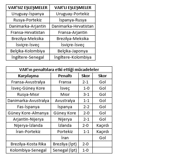 Takımların yerlerinde değişimlere sebep olan VAR sistemi son 16 turunda gerçekleşen eşleşmelerin yüzde 75'ini de etkiledi. VAR sistemi ile çıkan penaltı kararları görmezden gelindiğinde 8 eşleşmenin 6'sı farklı olurken, sadece Brezilya-Meksika ile İsviçre-İsveç eşleşmesi bu sistemden etkilenmedi