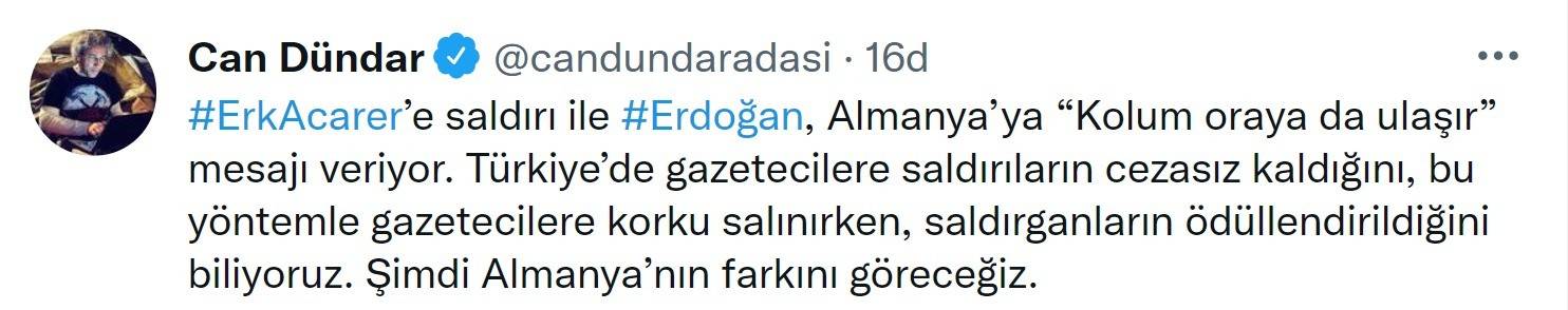 "Erk Acarer'e saldırı ile Erdoğan, Almanya'ya 'Kolum oraya da ulaşır' mesajı veriyor. Türkiye'de gazetecilere saldırıların cezasız kaldığını, bu yöntemle gazetecilere korku salınırken, saldırganların ödüllendirildiğini biliyoruz. Şimdi Almanya'nın farkını göreceğiz."