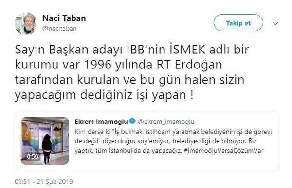 İmamoğlu'nun bu mesajına bir vatandaştan gelen cevap ise dikkat çekti. Tweete gelen cevapta vatandaş, "Sayın Başkan adayı İBB'nin İSMEK adlı bir kurumu var 1996 yılında RT Erdoğan tarafından kurulan ve bu gün halen sizin yapacağım dediğiniz işi yapan!" ifadelerini kullandı.