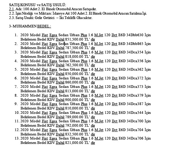 Devletin resmi ilan portalı ilan.gov.tr’de, “100 Adet 2.El Binek Otomobil Aracın Gelir Getirici Olarak Satışı” başlığıyla duyurusu yapılan ihalede, Fiat Egea Sedan Urban Plus 1.6 M.Jet modelleri için ortalama 780 bin TL ile 850 bin TL arasında fiyat talep edilirken, Renault Megane Sedan Icon 1.5 model araçlar için ise 1 milyon 120 bin TL satış bedeli belirlendi. 2020 Model Skoda Superb 1.6 TdiScr model lüks otomobiller için KDV dahil 1 milyon 431 bin 500 lira talep eden CHP’li İBB yönetimi, belediyeye ait Volkswagen Passat 2.0 Tdi 150 DsgElegance araçlar için ise 1 milyon 800 bin lira bedel belirledi.