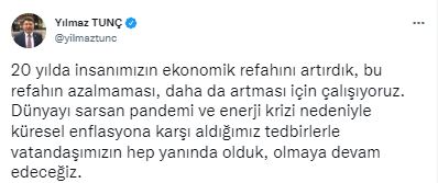 Resmi sosyal medya hesabından paylaşımda bulunan AK Parti Grup Başkanvekili ve Bartın Milletvekili Yılmaz Tunç, “20 yılda insanımızın ekonomik refahını artırdık, bu refahın azalmaması, daha da artması için çalışıyoruz. Dünyayı sarsan pandemi ve enerji krizi nedeniyle küresel enflasyona karşı aldığımız tedbirlerle vatandaşımızın hep yanında olduk, olmaya devam edeceğiz.”