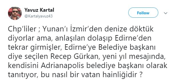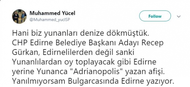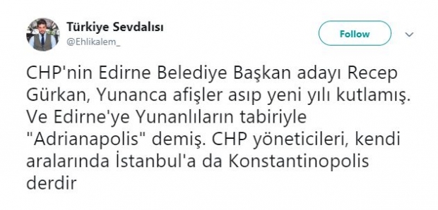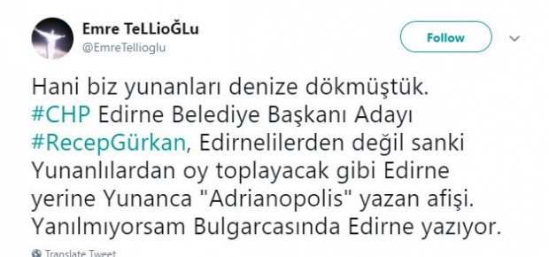Gürkan, Yunanca hazırlanan afişte kendisini 'Edirne Belediye Başkanı' yerine şehrin Bizans'taki adı olan 'Adrianapolis belediye başkanı' olarak tanıttı.