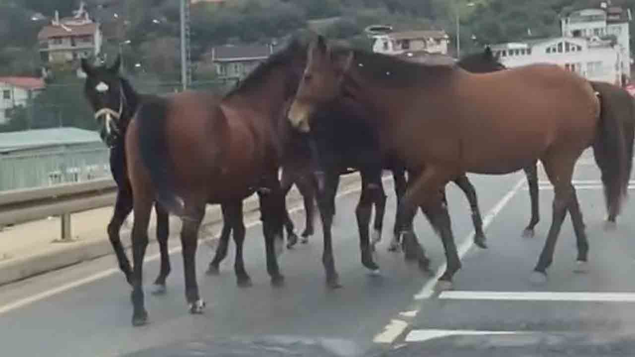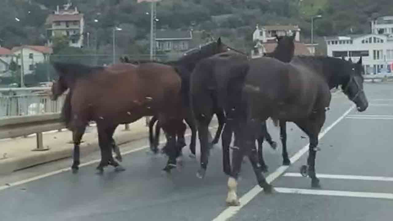 Beykoz Riva Yolu’nda başıboş dolaşan 6 at, trafikte tehlikeli anlara neden olurken bir yandan da görenleri tebessüm ettirdi; o anlar bir sürücü tarafından cep telefonuyla görüntülendi.