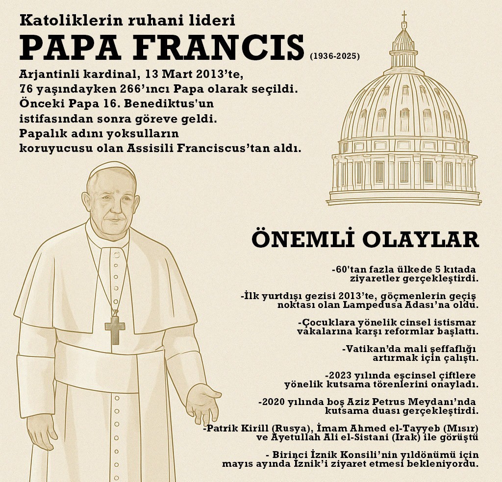 Vatikan'dan yapılan açıklamada, Katoliklerin ruhani lideri Papa Francis'in hayatını kaybettiği duyuruldu. Papa Franciscus'un bu sabah yerel saatle 07.35'te yaşamını yitirdiği ifade edildi. 88 yaşındaki Francis, 12 yıldır papalık görevinde bulunuyordu.
