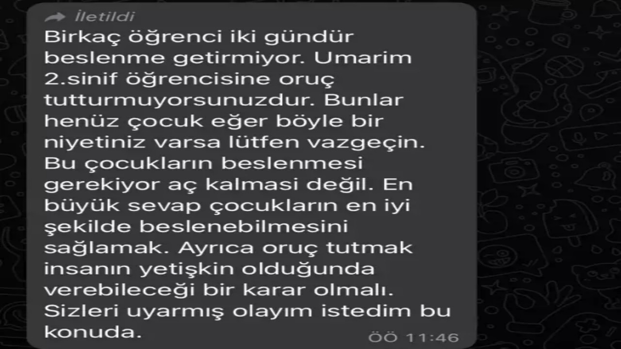 Eğitim yuvalarını ideolojik cepheye çeviren zihniyet yine iş başında... Bir ilkokul öğretmeni, oruç tutan minik yavruların ibadetine göz dikti. Müslüman Anadolu insanın inancına dil uzatan sözde öğretmen, velilere gönderdiği mesajla "Bu kadarına da pes" dedirtti.