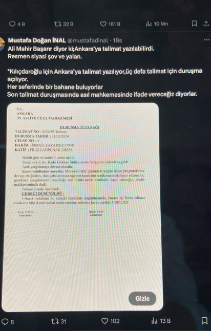 CHP eski Genel Başkanı Kemal Kılıçdaroğlu hakkında Cumhurbaşkanı Erdoğan'ın eski avukatı Mustafa Doğan İnal'a 'hakaret' ettiği iddiası ile açılan davada zorla getirme kararı çıkarılmıştı. Mahkeme Ankara’ya talimat yazacağına polis zoruyla getirilmesine karar verdi diyerek algı operasyonu yapan ahlaksızlara İnal, CHP’li Ali Mahir Başarır üzerinden mahkeme kararı ile cevap verdi.