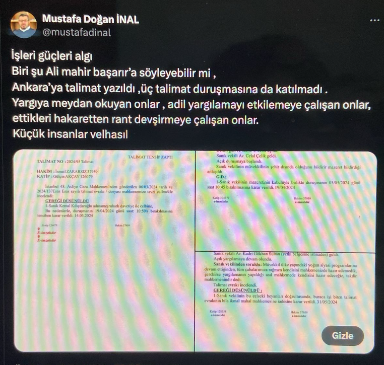 “Mahkeme Ankara’ya talimat yapacağına Kılıçdaroğlu’nu polis zoruyla getirilmesine karar verdi” diye algı yapanlara Cumhurbaşkanının eski avukatı Mustafa Doğan İnal sosyal medya üzerinden yaptığı paylaşımla cevap verdi.