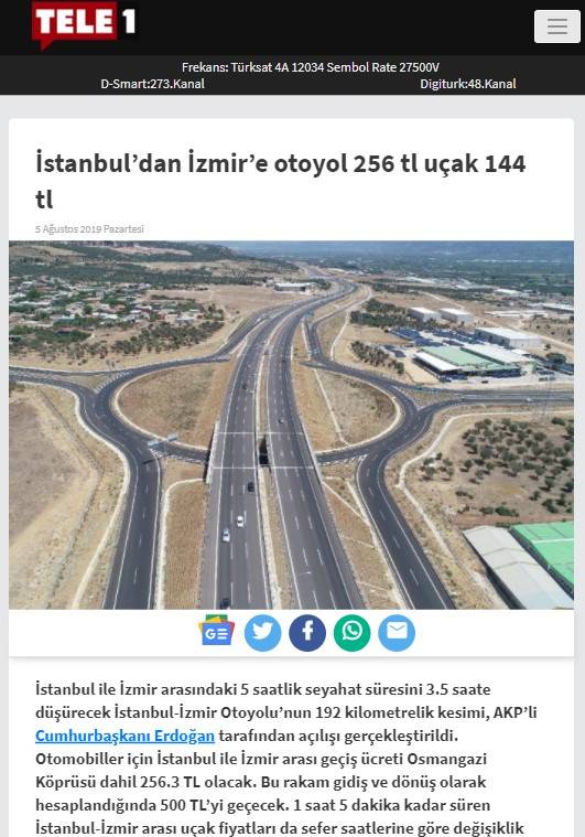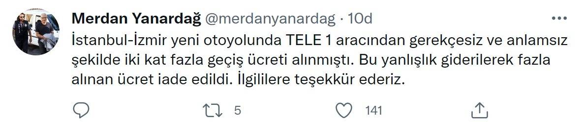 "İstanbul-İzmir yeni otoyolunda TELE 1 aracından gerekçesiz ve anlamsız şekilde iki kat fazla geçiş ücreti alınmıştı. Bu yanlışlık giderilerek fazla alınan ücret iade edildi. İlgililere teşekkür ederiz."