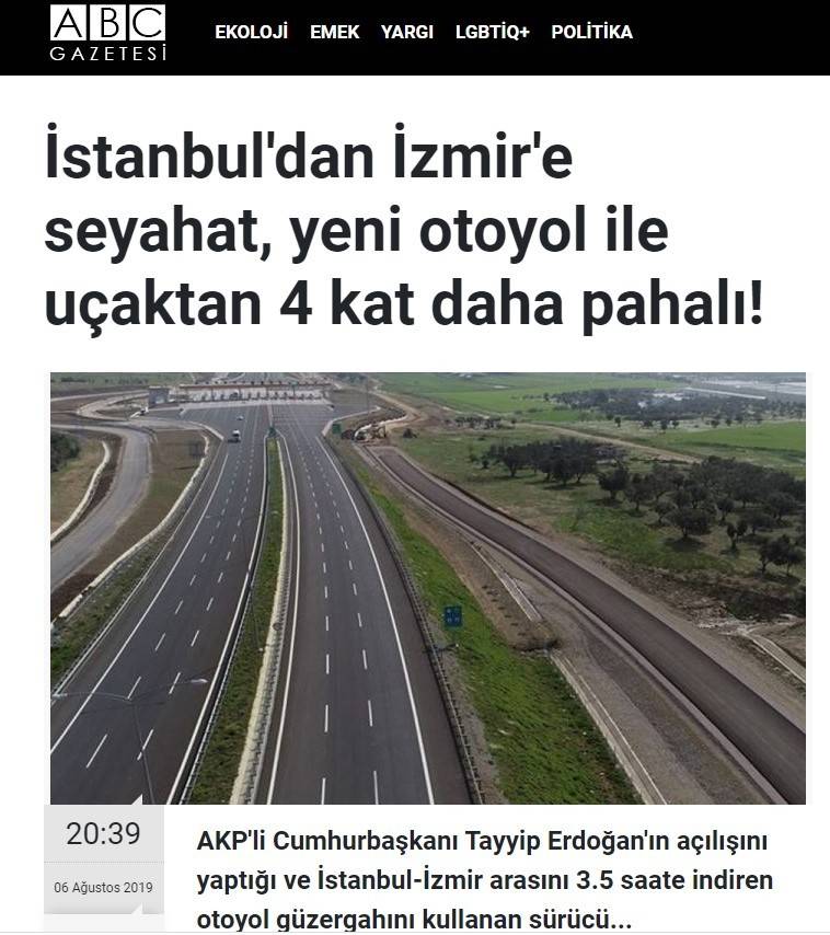 Merdan Yanardağ'ın yönetimindeki ABC Gazetesi ve TELE1 televizyonu ile internet sitesinde, İstanbul-İzmir yeni otoyoluna uçaktan bile pahalı olduğu çamuru atılmıştı.
