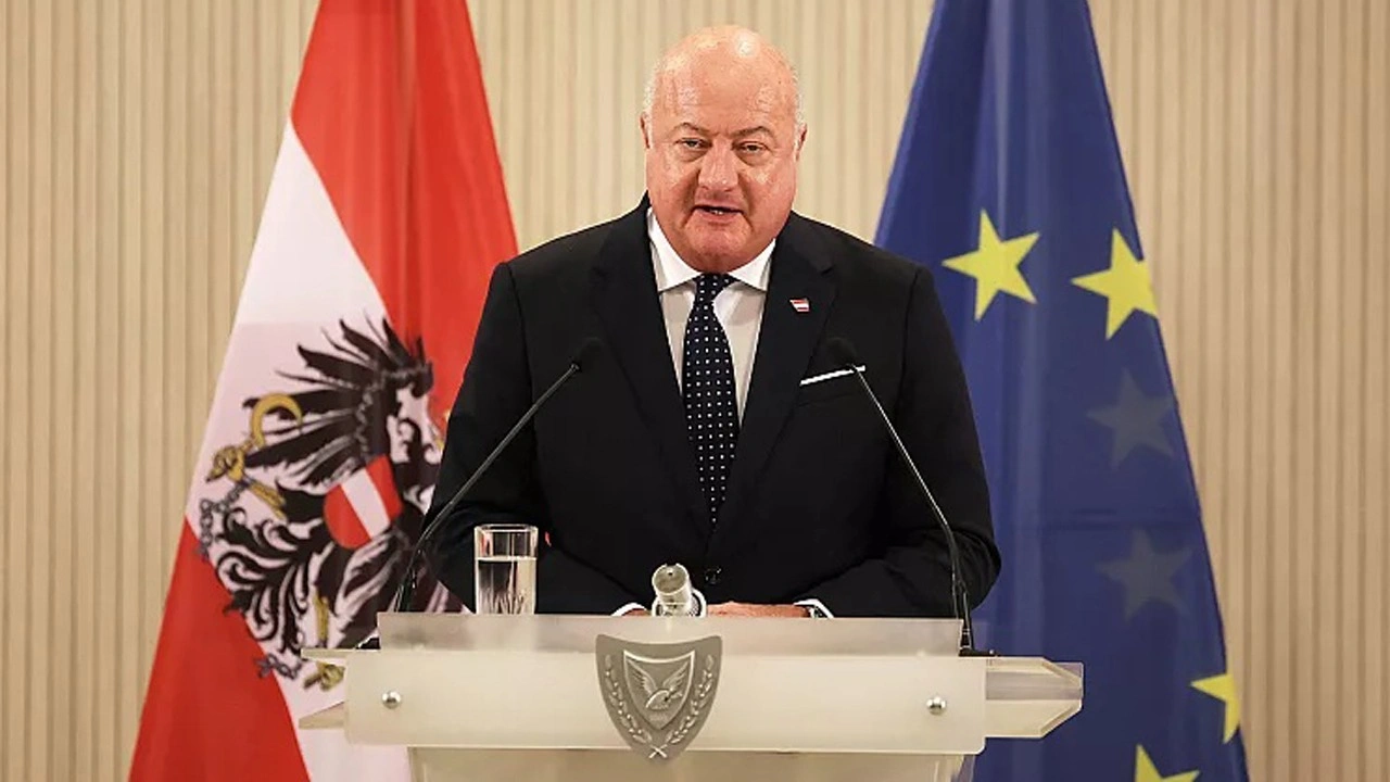 Avusturya Şansölyesi Christian Stocker Lefkoşa'da düzenlenen bir basın toplantısında konuşuyor, 22 Ağustos 2025