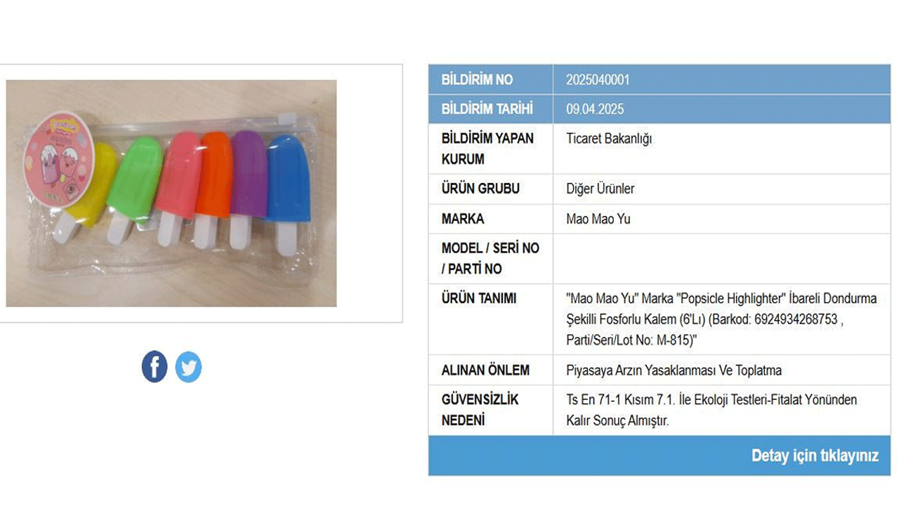 Ticaret Bakanlığı, 'Güvensiz Ürün Bilgi Sistemi' üzerinden sağlık riski barındıran yeni ürünleri kamuoyuna açıkladı. İlgili listede bir adet kırtasiye ürününün satışı yasaklandı. Ürünün piyasadan toplatılmasına da karar verildi.