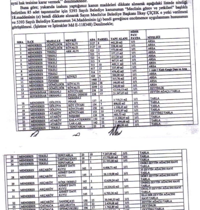 CHP'li Başkan İlkay Çiçek'in adeta bir "kasaba emlakçısı" tarzında satışa hazırlandığı taşınmazlar arasında tarla ve başka niteliklerde tarım arazileri, zeytinlikler ve üzerinde imar barışından yararlanılmasına rağmen ön alım hakları yok sayılan vatandaşlara ait konutların bulunduğu çok sayıda arsa daha bulunuyor.