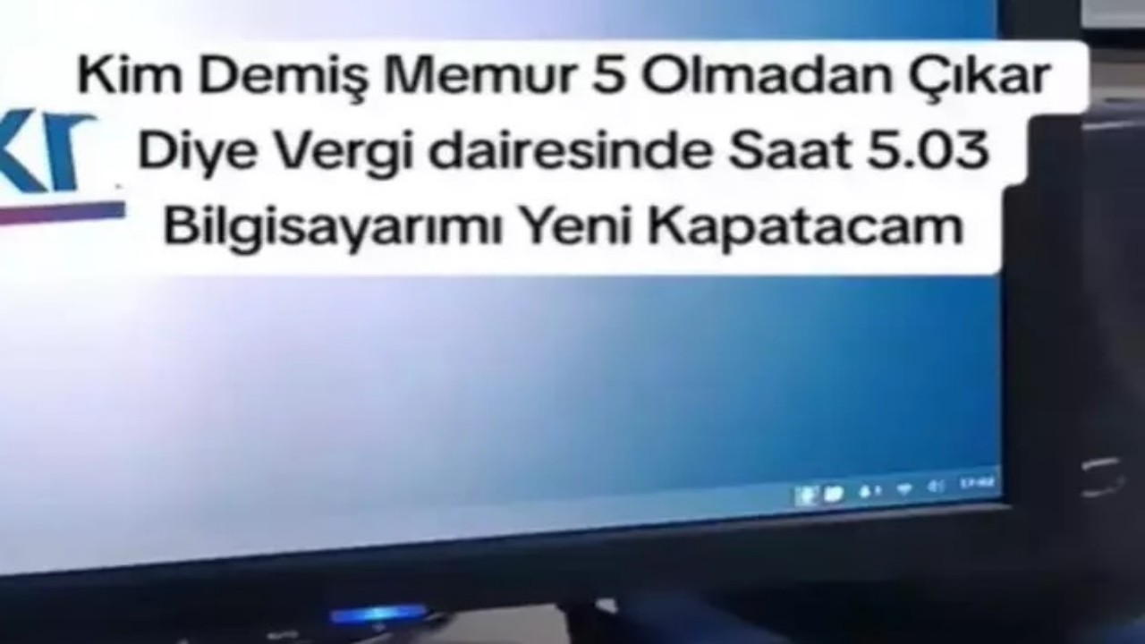 Adana'da vergi memuru olduğu öne sürülen bir sosyal medya kullanıcısının paylaştığı video gündem oldu. Bilgisayar ekranındaki saati gösteren kullanıcı, "Kim demiş memur 5 olmadan çıkar diye... Saat 17.03, ben bilgisayarımı yeni kapatacağım" ifadelerini kullandı.