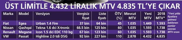 Gazete Habertürk'ten Yiğitcan Yıldız'ın haberine göre, yeni MTV oranları 2018’de fiyatlarda beklenen zamlarla birlikte bazı modellerin vergi oranını bir üst dilime taşıyabilir.