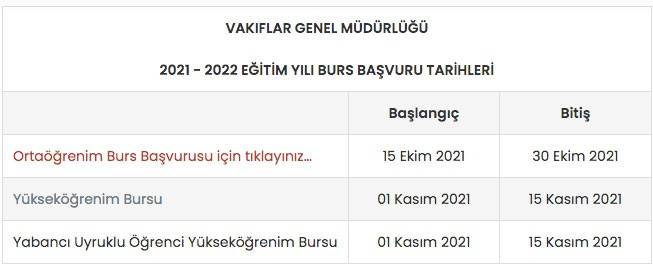 Vakıflar Genel Müdürlüğü (VGM) resmi internet sitesinden yapılan açıklamaya göre, İlkokul, ortaokul ve lise öğrencilerine verilen burslar için başvurular, www.vgm.gov.tr üzerinden elektronik ortamda alınacak.