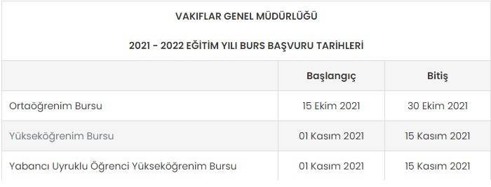 Vakıflar Genel Müdürlüğü, ortaöğrenim ve yükseköğrenim burs başvuru tarihlerini açıkladı. VGM'den yapılan açıklamada, "Genel Müdürlüğümüzce ilkokul, ortaokul ve lise öğrencilerine verilen Ortaöğrenim Eğitim Yardımları ile üniversite öğrencilerine verilen Yükseköğrenim Bursları ve Yabancı Uyruklu Öğrenci Yükseköğrenim Bursları için başvurular 2021 – 2022 eğitim yılında aşağıdaki tarihler arasında vgm.gov.tr üzerinden elektronik ortamda alınacaktır. 2021-2022 eğitim yılında eğitim yardımı/burs miktarlarında artış yapılmış olup ortaöğrenim eğitim yardımı aylık 100,00 TL, yükseköğrenim bursu aylık 400,00 TL, yabancı uyruklu öğrenci yükseköğrenim bursu ise aylık 600,00 TL olarak belirlenmiştir” denildi.