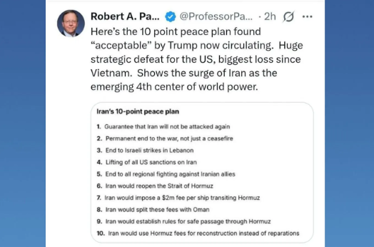 ABD Başkanı Donald Trump’ın İran ile vardığı 10 maddelik ateşkes planı, Amerikan akademik dünyasında sert bir dille eleştirilmeye başlandı. Dünyaca ünlü strateji uzmanı ve Şikago Üniversitesi Profesörü Robert Pape, bu anlaşmanın Amerika Birleşik Devletleri (ABD) için "Vietnam Savaşı’ndan bu yana en büyük stratejik yenilgi" olduğunu savundu.