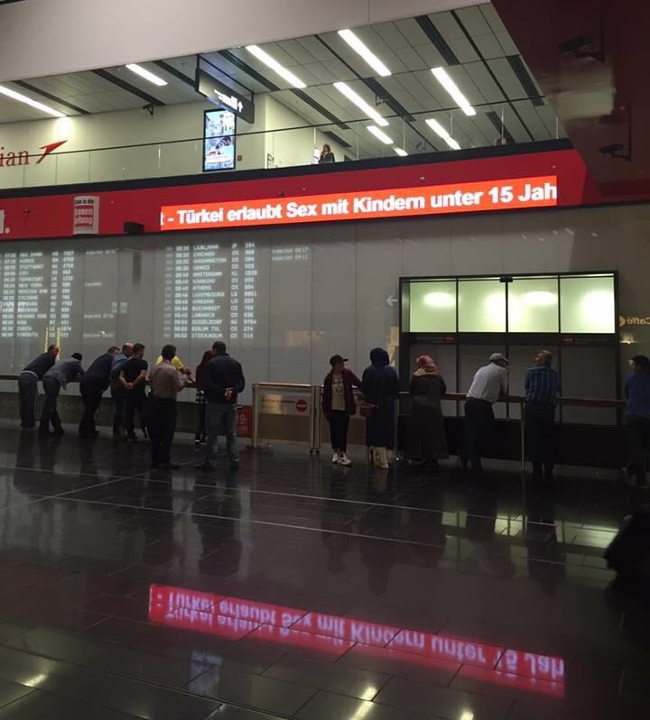 Aynı havalimanı bu kez çok daha çirkin bir provokasyonla gündeme geldi. Viyana Havalimanı'nda, "Türkiye'de 15 yaşından küçük çocuklarla cinsel ilişkiye izin veriliyor" yazısının yer aldığı ahlaksızca bir yalan, afiş yapılarak duvarlara asıldı.