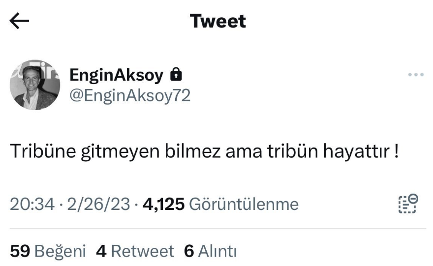 Aksoy, Twitter hesabından paylaştığı mesajda, "Tribüne gitmeyen bilmez ama tribün hayattır." ifadelerini kullandı.