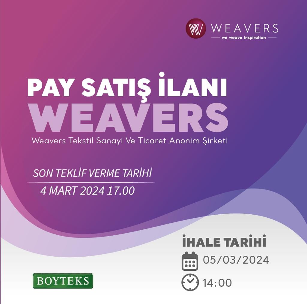 Boyteks Tekstil AŞ, döşemelik ve perdelik kumaş üreticileri arasında yer alan Weavers Tekstil Sanayi ve Ticaret Anonim Şirketindeki (Weavers) paylarını; açık ihale usulü ile kapalı teklif isteme ve açık artırma yöntemlerinin birlikte uygulanması suretiyle satışa sundu. Weavers’taki tüm paylarını satışa çıkaran Boyteks Tekstil AŞ’in 2016 yılında FETÖ/PDY soruşturması kapsamında yönetimi kayyıma devredilmiş ve Ağır Ceza Mahkemesi’nin vermiş olduğu müsadere kararının Yargıtay tarafından da onanmasıyla mülkiyeti Hazine’ye intikal etmişti. Dünyanın önde gelen bağımsız değerleme şirketi tarafından hazırlanan rapora göre; Weavers’in muhammen bedeli 1.700.000.000,00-TL (Birmilyaryediyüzmilyon Türk Lirası) olarak belirlendi. Yatırımcılar teklif vermeden önce satış ilanında belirtilen koşulları sağladıkları taktirde 25 Ocak ve 26 Şubat tarihleri arasında Weavers tesislerini gezebilecek ve elektronik ortamda sunulacak olan Bilgi Odası’ndan şirkete ilişkin detaylı bilgilere erişim imkânı bulacaktır. Yatırımcıların, ihale şartnamesi kapsamında hazırladıkları kapalı teklif zarflarını, en son 4 Mart 2024 saat 17:00’a kadar Tasarruf Mevduatı Sigorta Fonu Büyükdere Caddesi No:143 Esentepe 34394 Şişli/İstanbul” adresine elden teslim etmeleri gerekiyor. Kapalı zarf ile verilen teklifler 5 Mart 2024 saat 10:00’da TMSF Genel Merkezinde teklif veren yatırımcıların huzurunda açılarak İhale Komisyonu tarafından değerlendirilecek ve açık artırmaya geçilecektir.