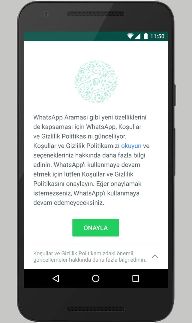 Sosyal medya devi Facebook'un bünyesinde olan dünyanı en çok kullanılan ücretsiz mesajlaşma uygulaması WhatsApp kullanıcılarının kızdıracak bir karara imza atmaya hazırlanıyor. WhatsApp 8 Şubat'tan itibaren yeni gizlilik ilkelerini devreye sokmaya hazırlanıyor. Şirketten yapılan açıklamada, gizlilik ilkeleri arasında, tartışmaya neden olacak, "verilerin Facebook ile paylaşılması" da yer alıyor. Üstelik veri paylaşımına izin vermeyecek kullanıcıların, WhatsApp'ı kullanmasının mümkün olmayacağı belirtildi. Kullanıcılar, o güne kadar telefonlarına düşecek bir uygulama içi bildirimle, Facebook ile veri paylaşma koşullarını onaylamak durumunda kalacaklar. Onaylama yapmayan kullanıcıların ise uygulamaya erişiminin mümkün olamayabileceği bildirildi.